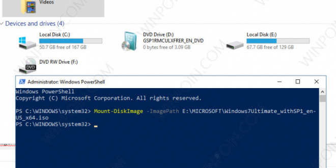 Alternatif lain yang bisa Kamu coba adalah dengan menggunakan Power Shell sebagai Administrator. pengguna cukup memasukkan perintah seperti di bawah ini. Pastikan untuk mengganti tulisan berwarna merah dengan path ISO berada.